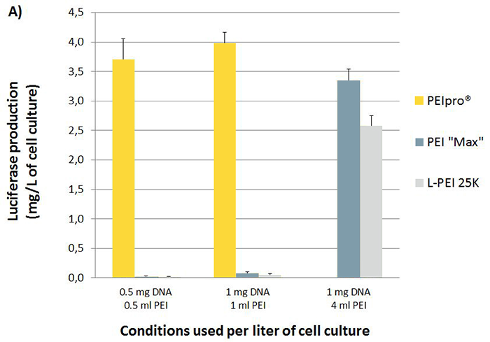 图3.与其它PEIs相比,PEIpro®所需更少转染试剂和较少/相似的DNA用量