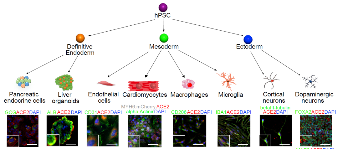 Yang等人的研究表明,hPSC来源的细胞和类器官为研究SARS-CoV-2的趋向性和COVID-19的造模提供了有价值的模型。hPSC来源的胰腺内分泌细胞、成体肝细胞和胆管细胞类器官对SARS-CoV-2易感。