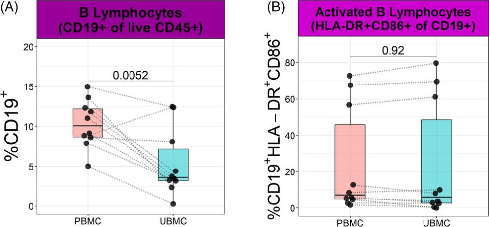 外周血B细胞(CD45+CD3-CD19+)占总活的CD45+白细胞比例高于胎盘床样品(分别为10.34 ± 0.94%和5.36 ± 1.33%)(图6A)。为了研究B细胞的活化状态,本文还检测了CD86和人类白细胞抗原(HLA)II类分子HLA-DR的表达。外周血和胎盘床样品中表达这两种受体的B细胞比例相似(图6B)。
